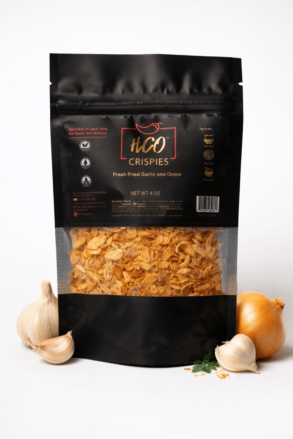Fresh Fried Garlic and Onion. The perfect crispy and crunchy topping for all your favorite foods.  Sprinkle on any food for that delicious addition of texture and flavor.  No heat so this great for those that want the flavor HCO has provided for you without the heat.  Great on salads, pizza, pasta, eggs, sandwiches and much more!  4 oz wt