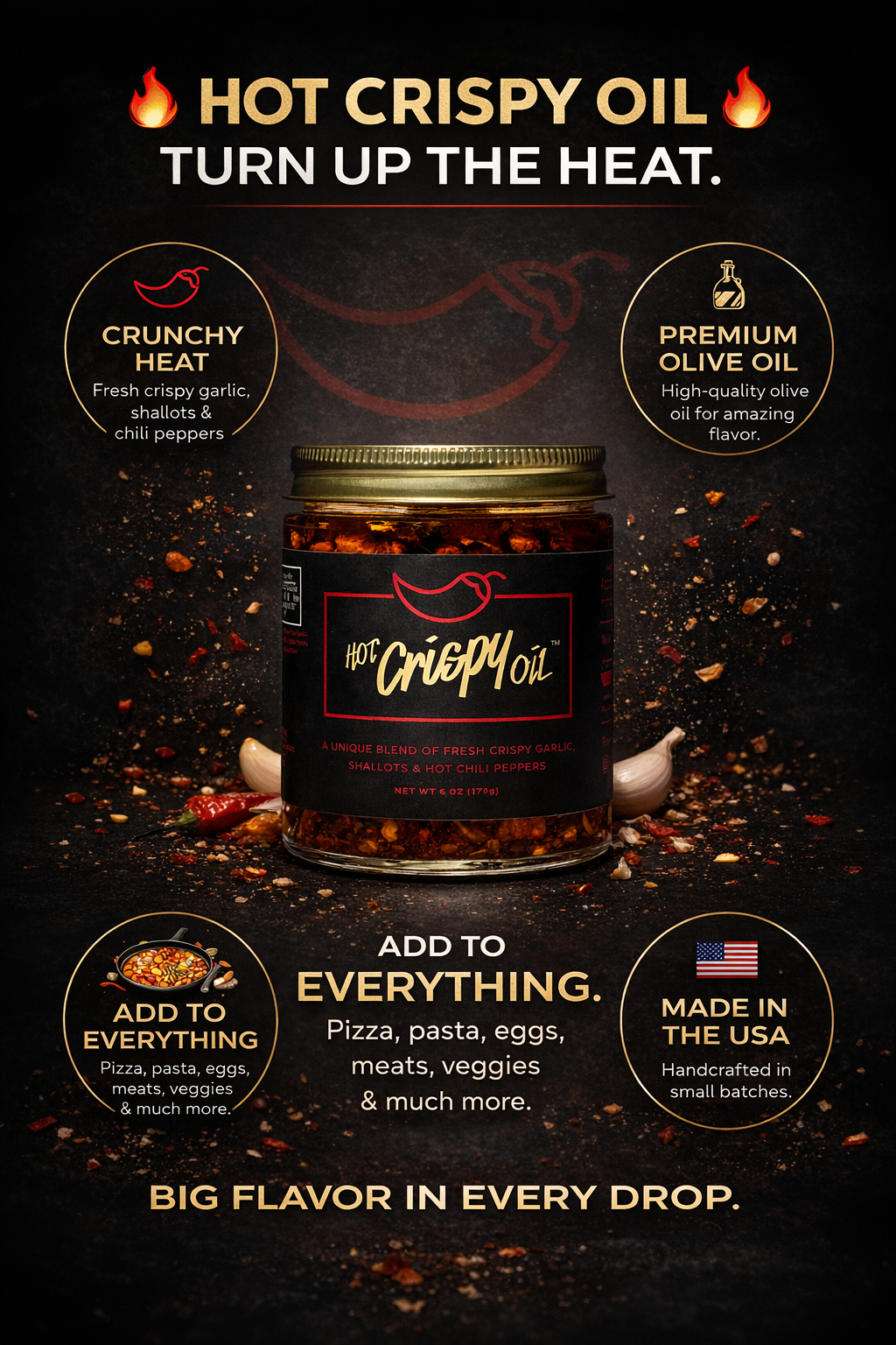 Our Hot Crispy Oil is great for cooking, dipping, dressings, savory fare and more. For everytime you want to add just enough "kick" to your favorite meal.